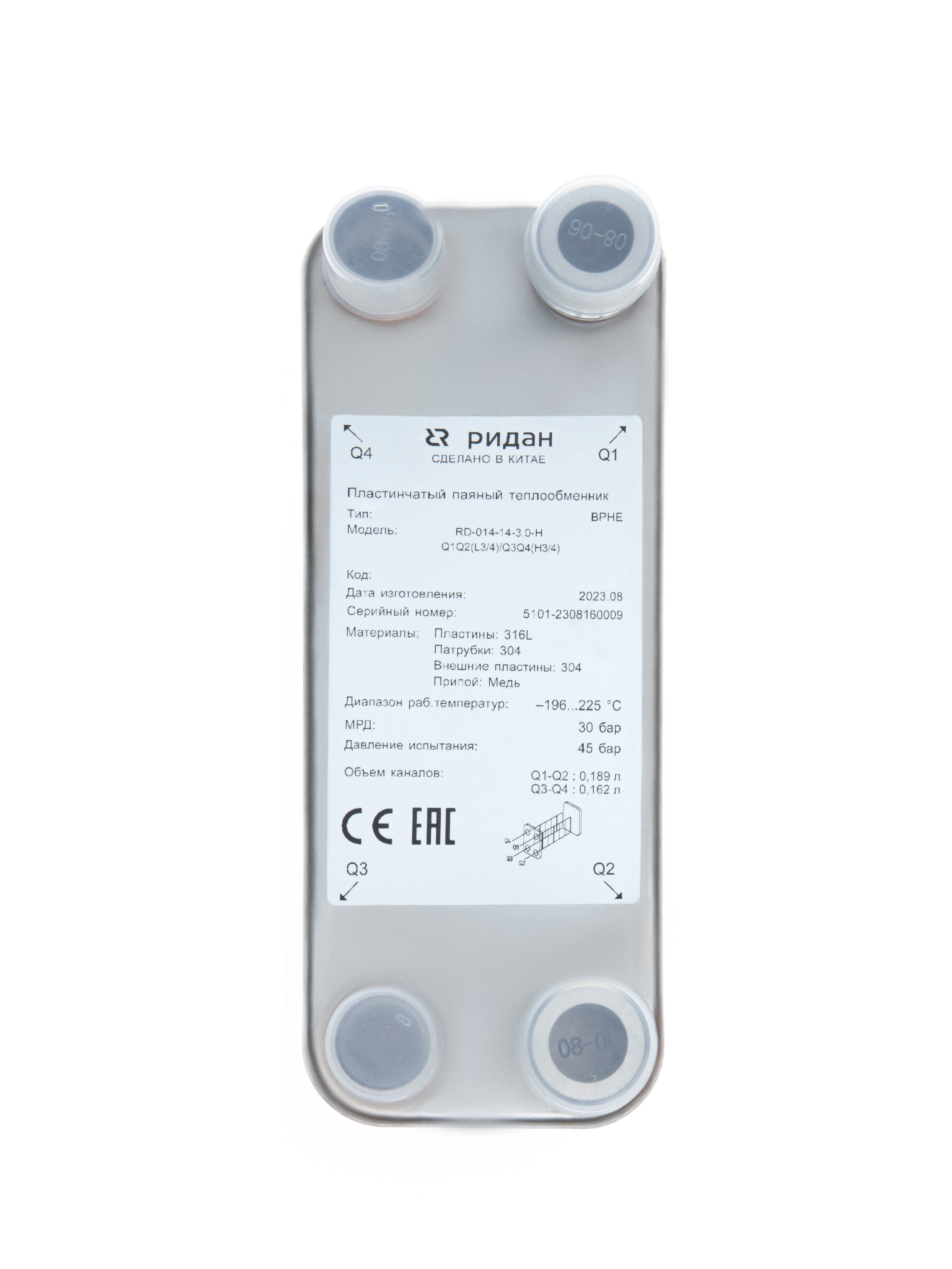 Ридан 021B0040R — Теплообменник пластинчатый паяный BPHE_RD-014-40-3,0-H, присоединительный штуцер Q1/Q2 — L3/4“, Q3/Q4 — H7/8“